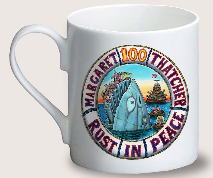 Thatcher Centenary Steve Bell design exclusive to Philosophy Football and available as a mug, tea towel,T-shirt and framed print here.